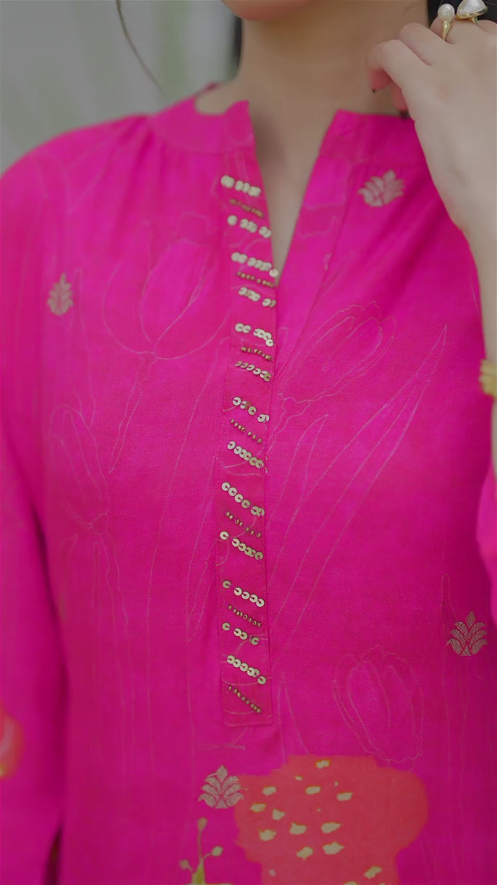 The embellished kurta features striking floral prints in vibrant pinks and whites, paired with straight-fit pants detailed with colorful embroidery at the hem.