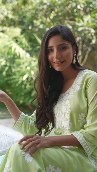 Green Kurta Embroidered details V neck Three-quarter, regular sleeves Thread Work Details Straight shaped Calf-length with straight hem and side slits Machine weave regular rayon
