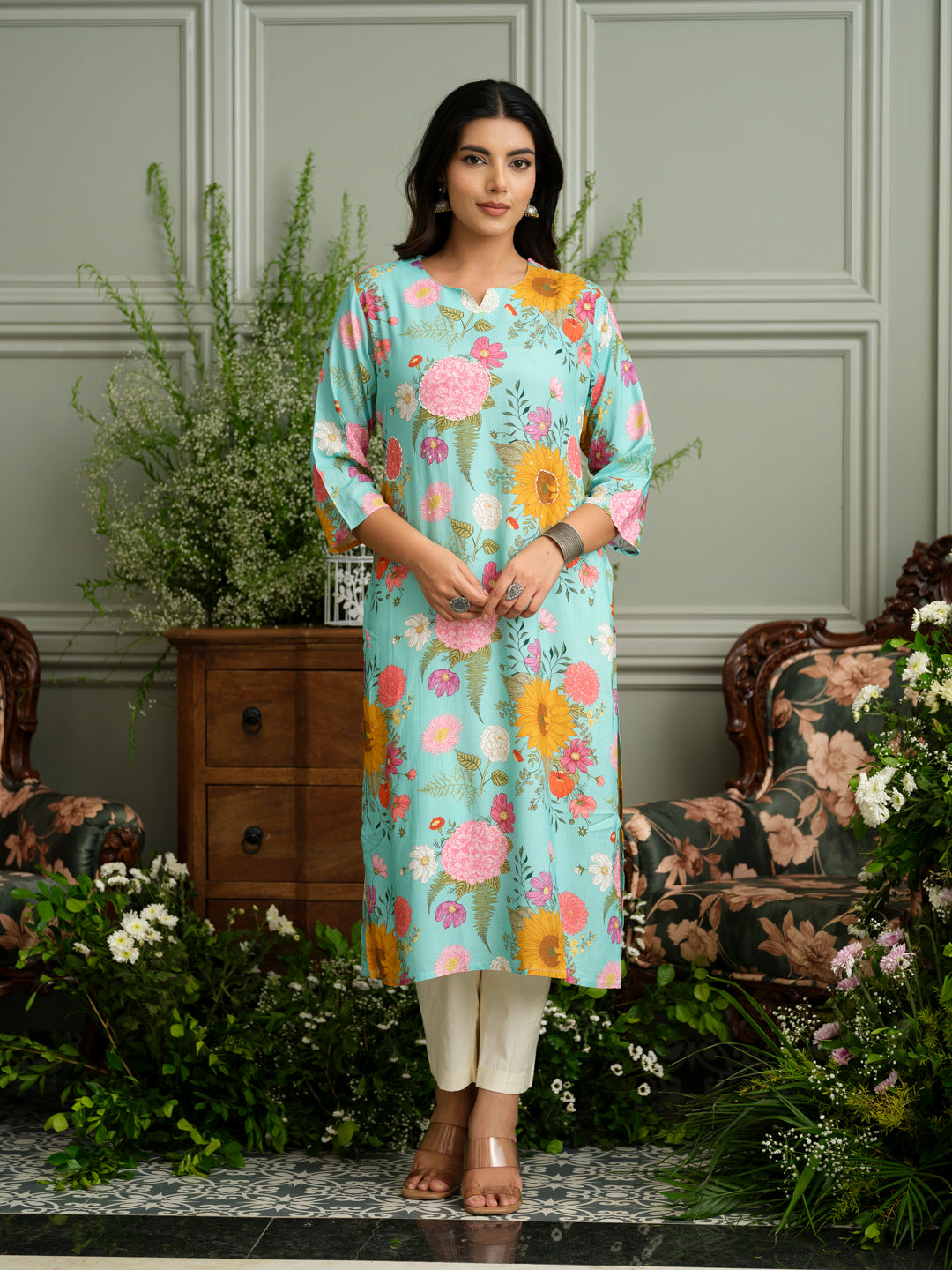 Step into elegance with this sky blue floral kurta set, designed to keep you effortlessly stylish and comfortable. Adorned with blooming multicolor florals in pink, yellow, and white, the kurta features a relaxed straight silhouette with a smart round neckline and 3/4th sleeves.