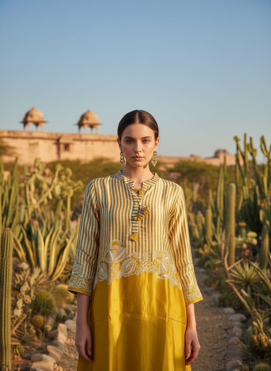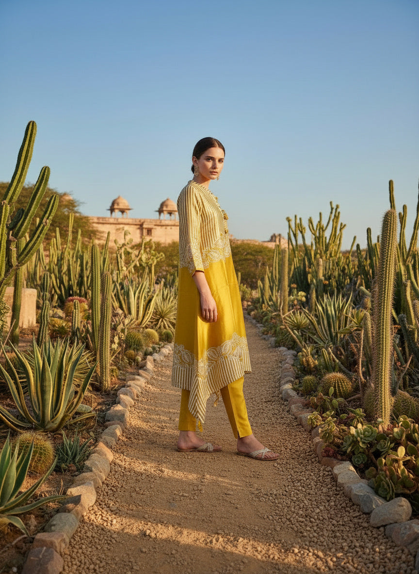 This co-ords consists of a shirt and trousers Yellow printed tunic.