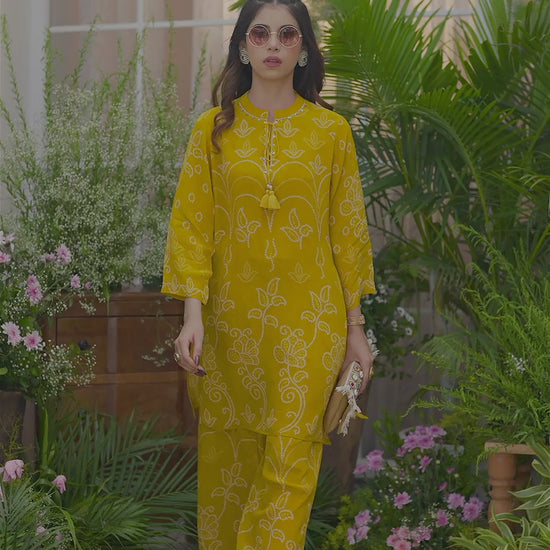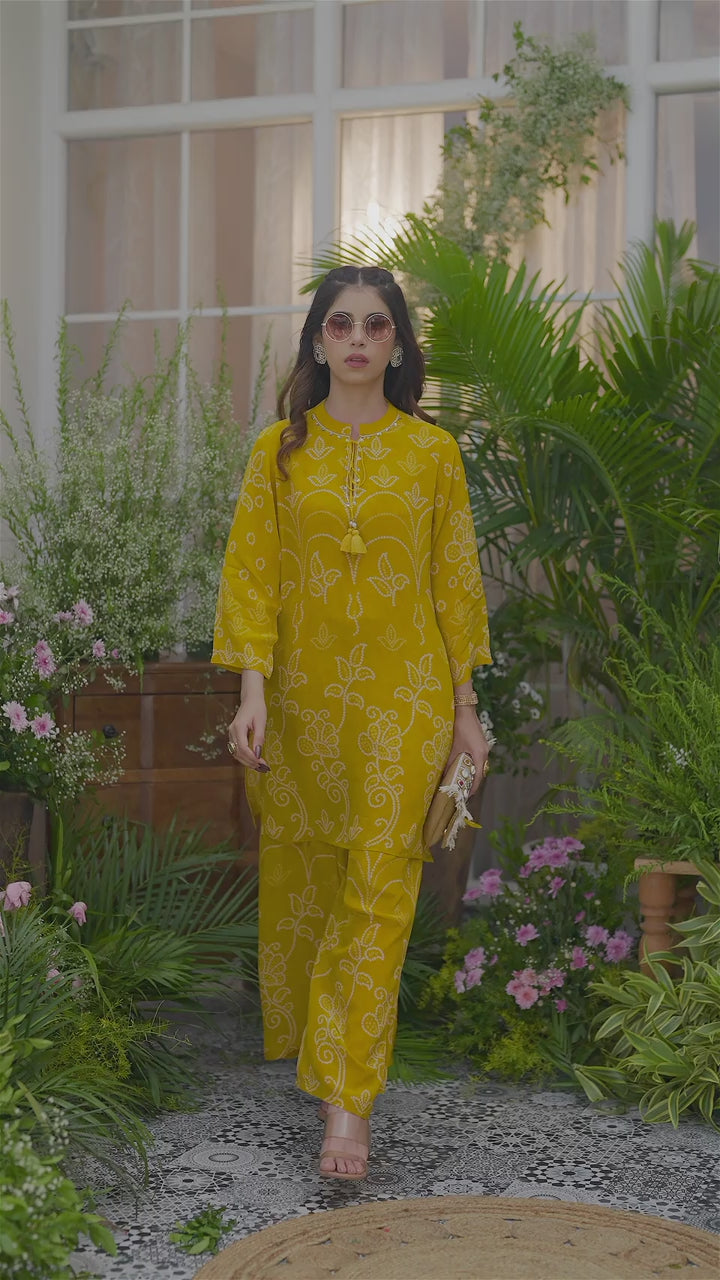 Sunlit Charm – Mustard Yellow Printed Co-Ord Set in Natural Crepe