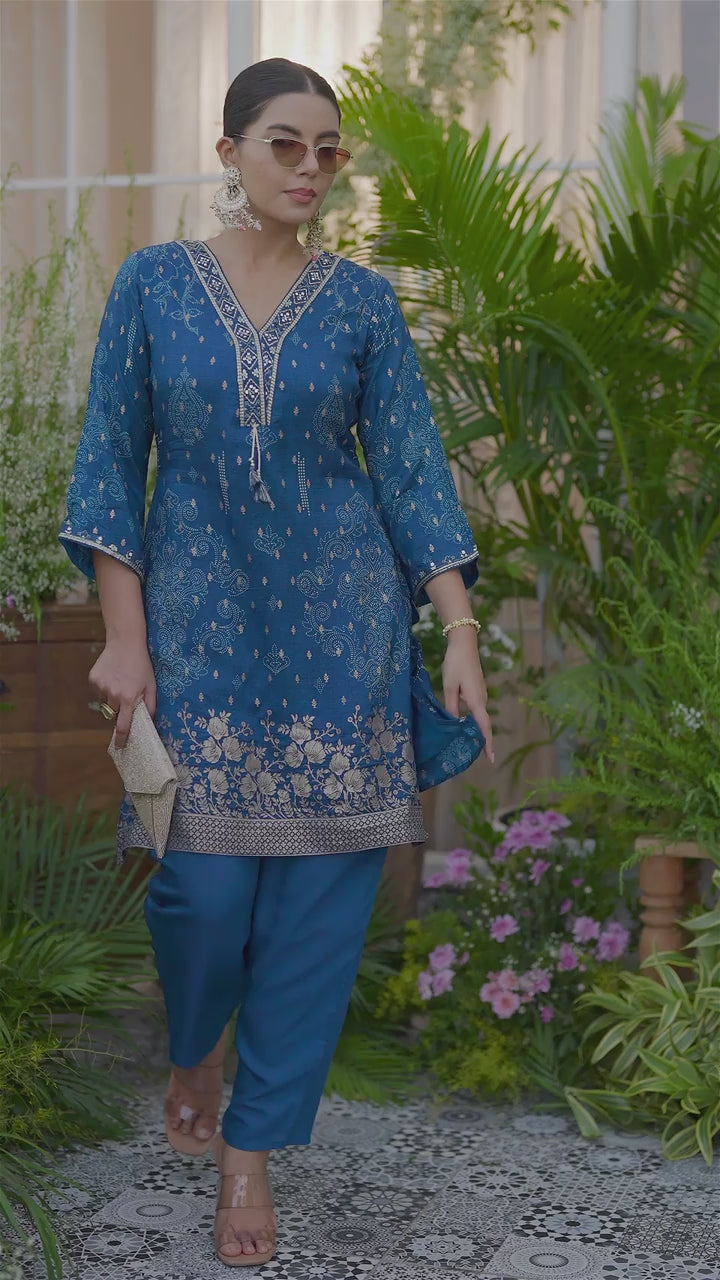 Teal Blue Handwork Jacquard Luxe Co-Ord Set