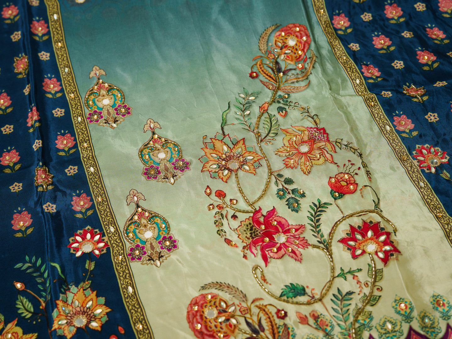 Turquoise Blue Floral Printed Flared A-Line Kurta With Trouser & Dupatta