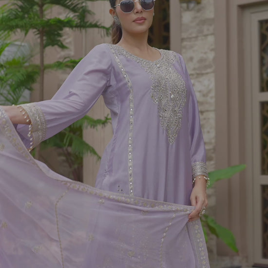 Poly Organza Purple Color Ethnic Motifs Embroidered Kurta With Trousers & Dupatta
