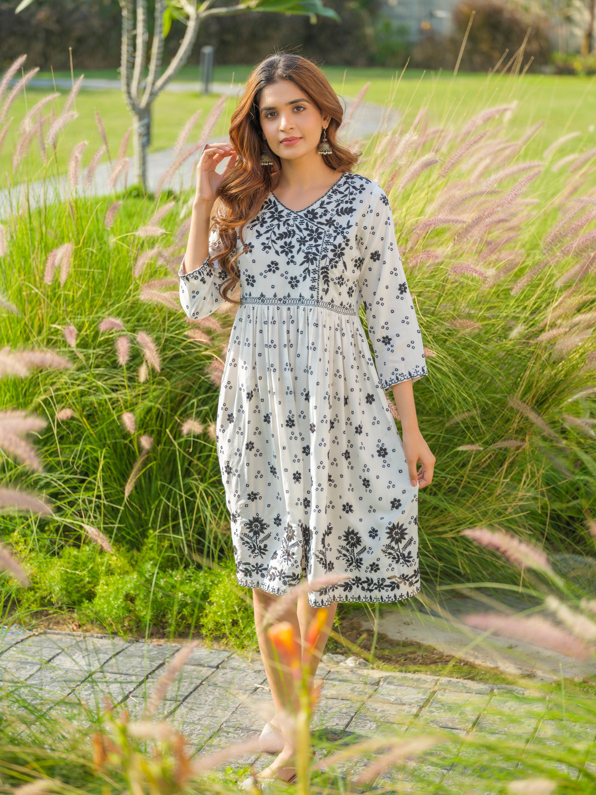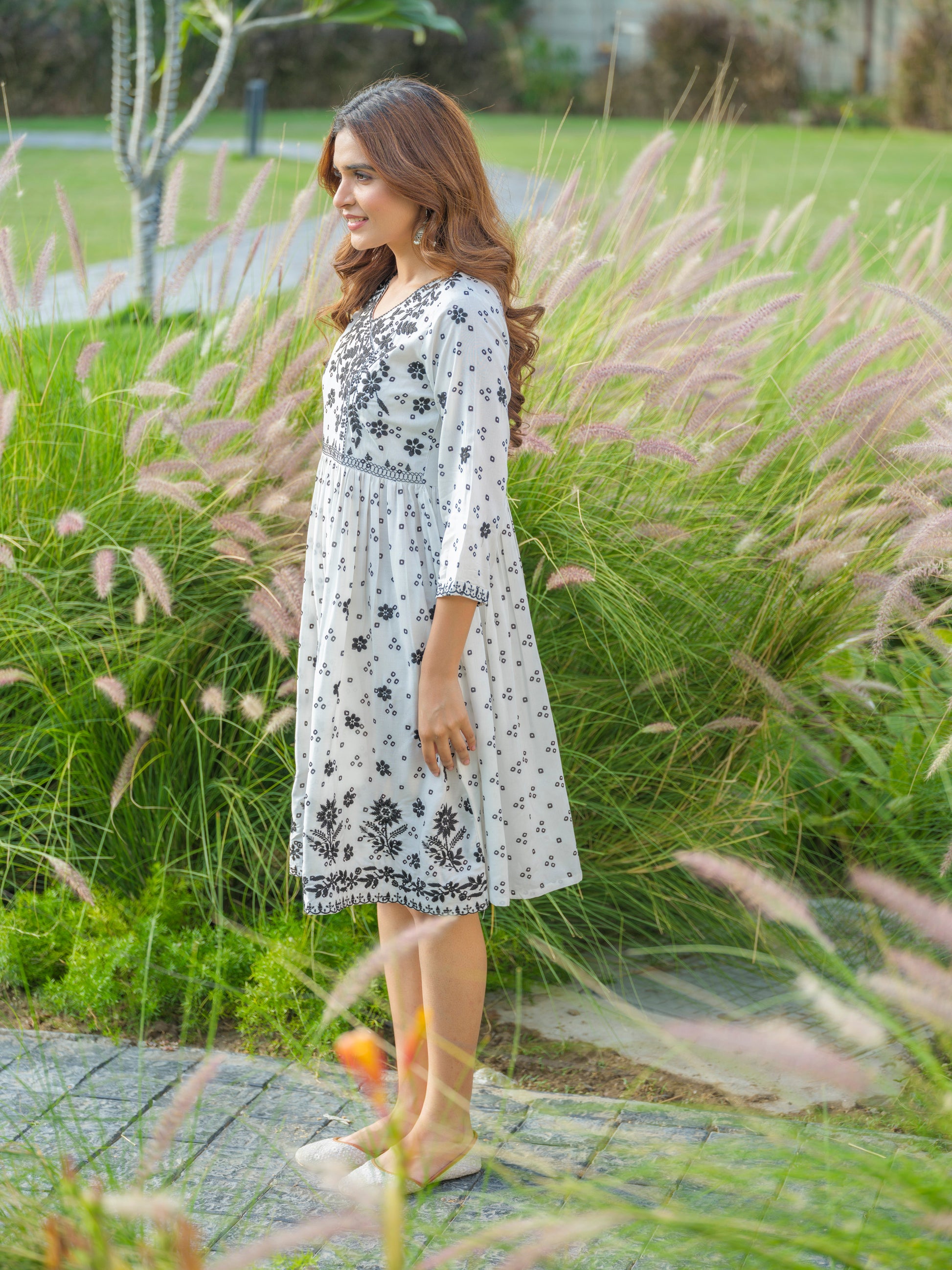 White Floral Embroidered V-Neck A-Line Ethnic Dress
