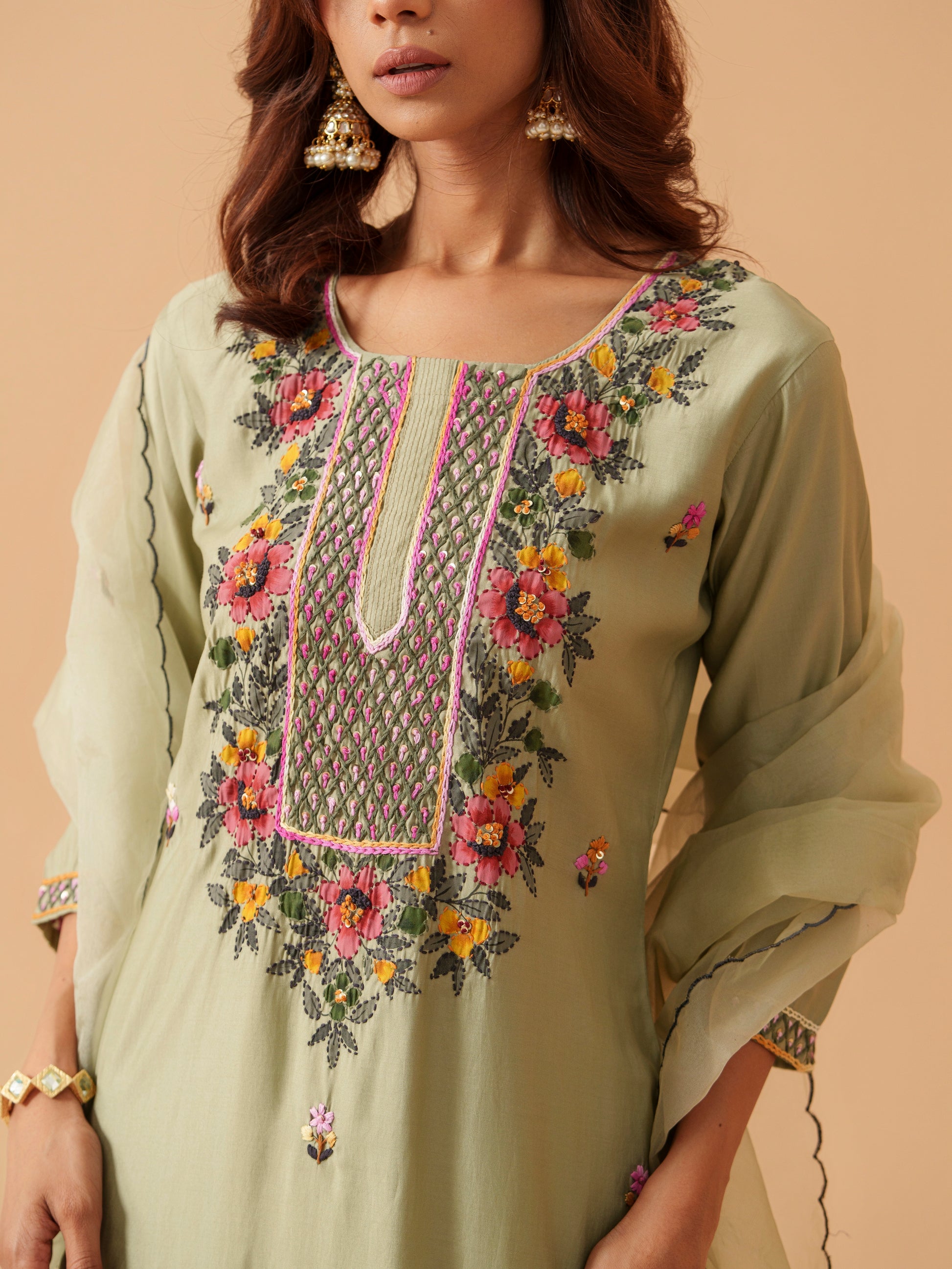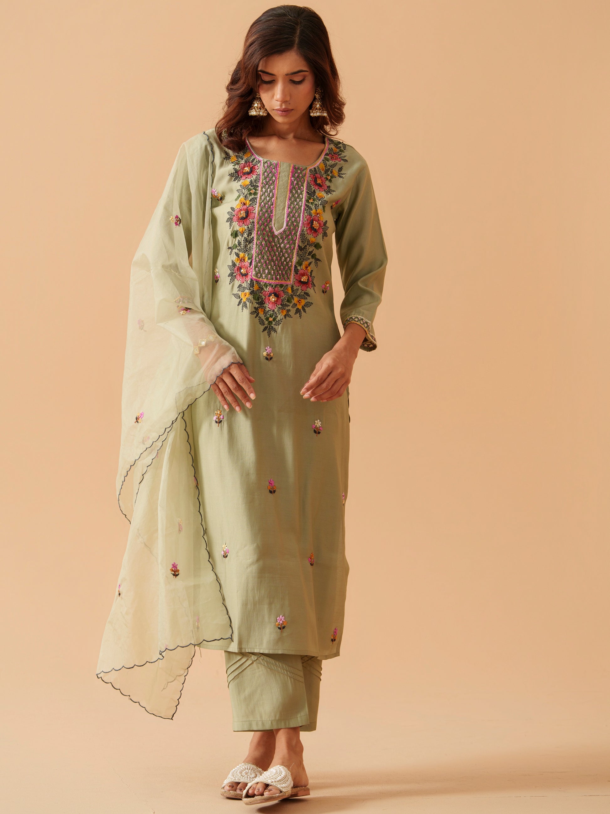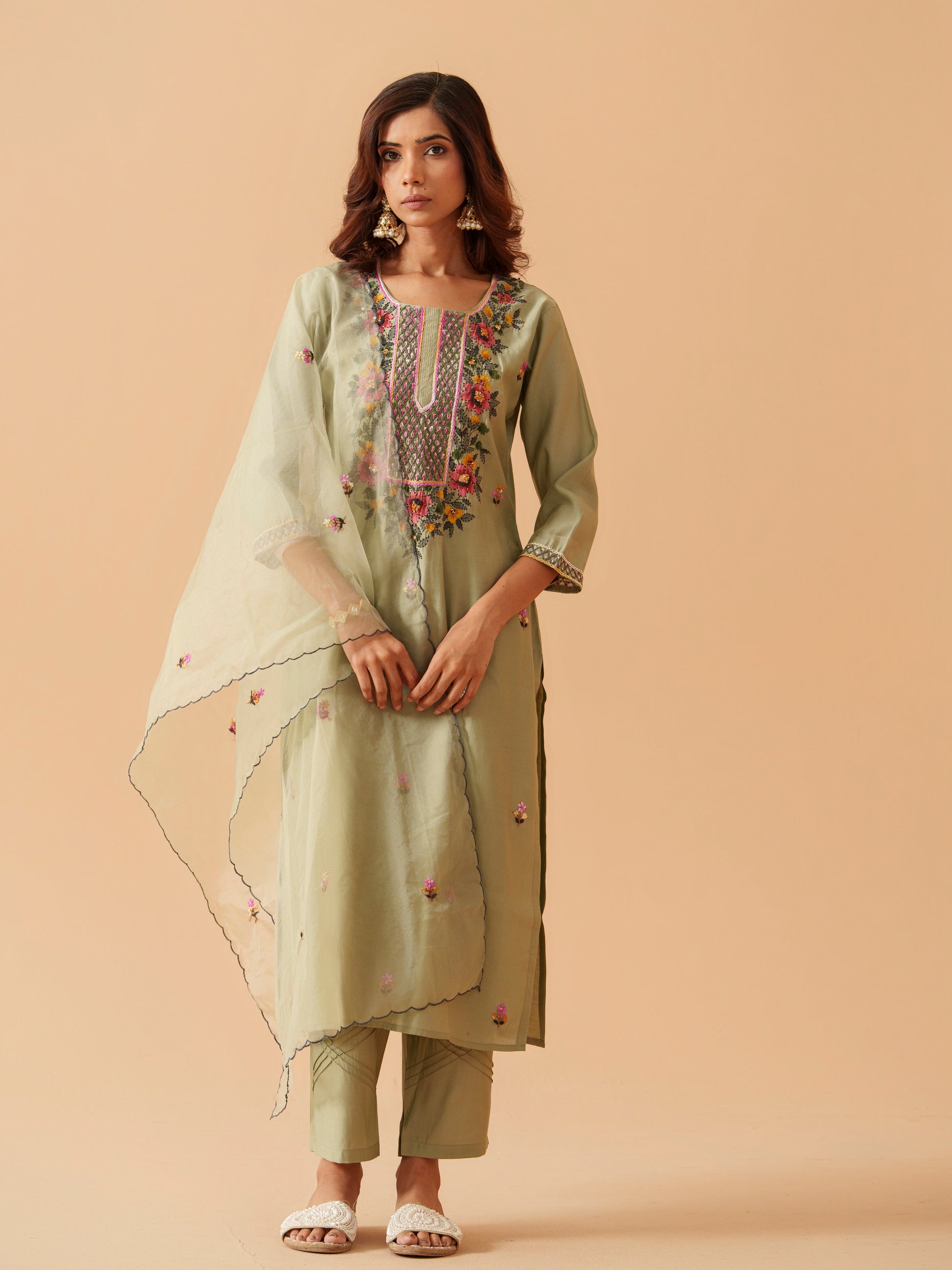 Floral Embroidered Straight Kurta With Trousers And Dupatta