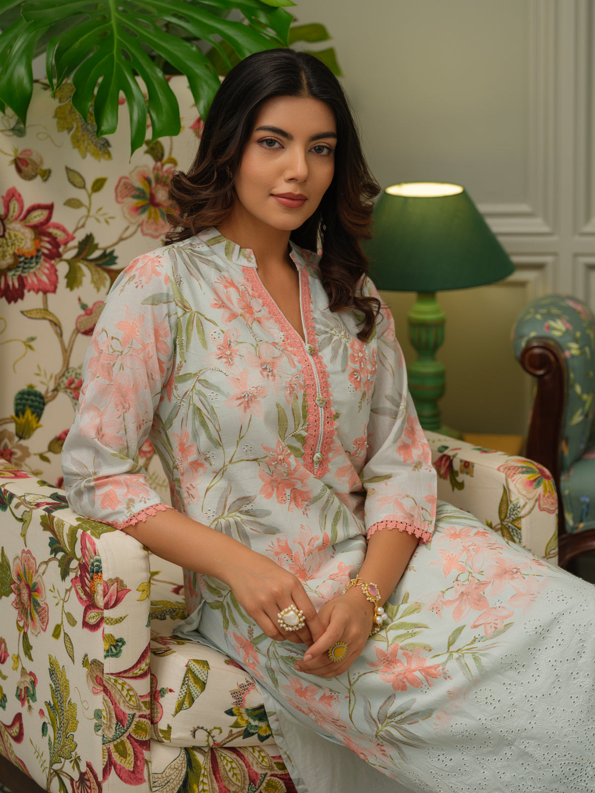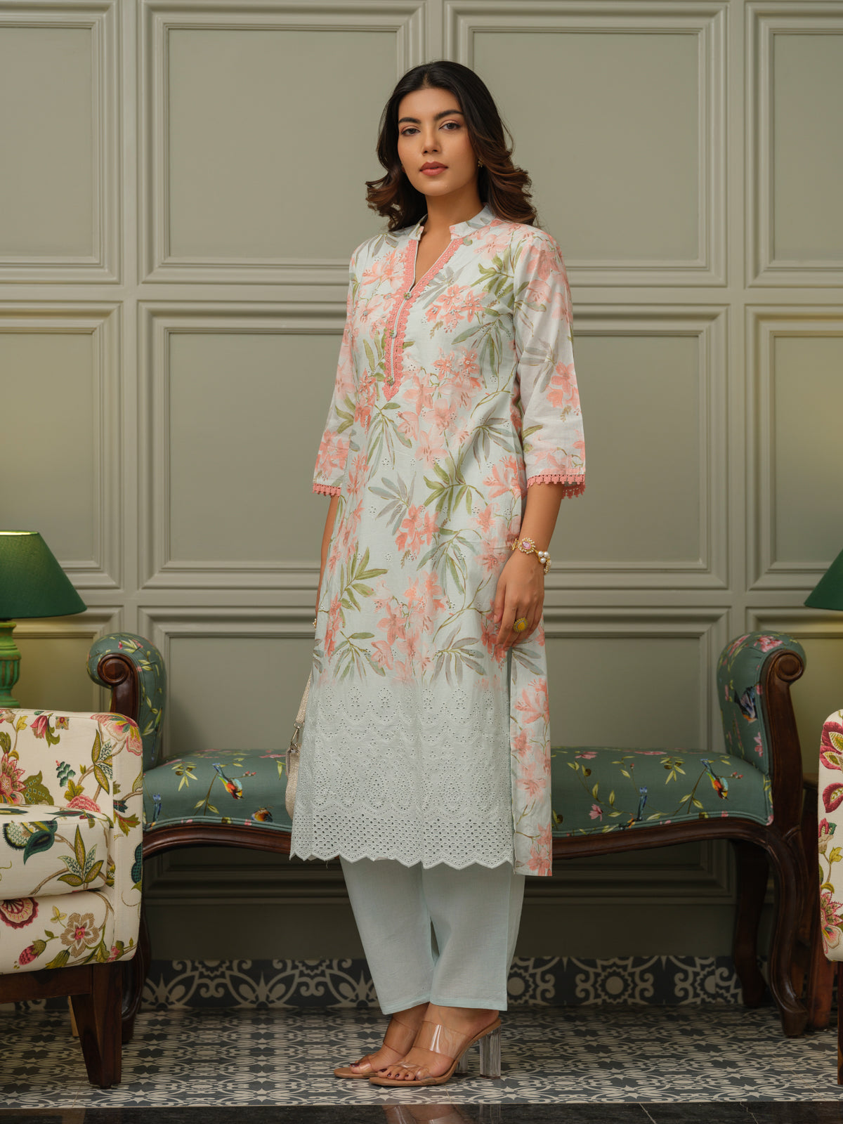 Turquoise Blue Floral Printed Flared A-Line Kurta With Trouser & Dupatta