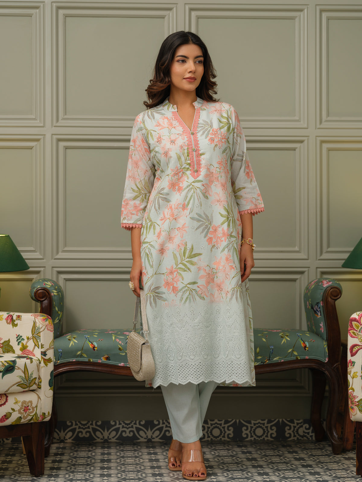 Floral Embroidered Straight Kurta With Trousers And Dupatta