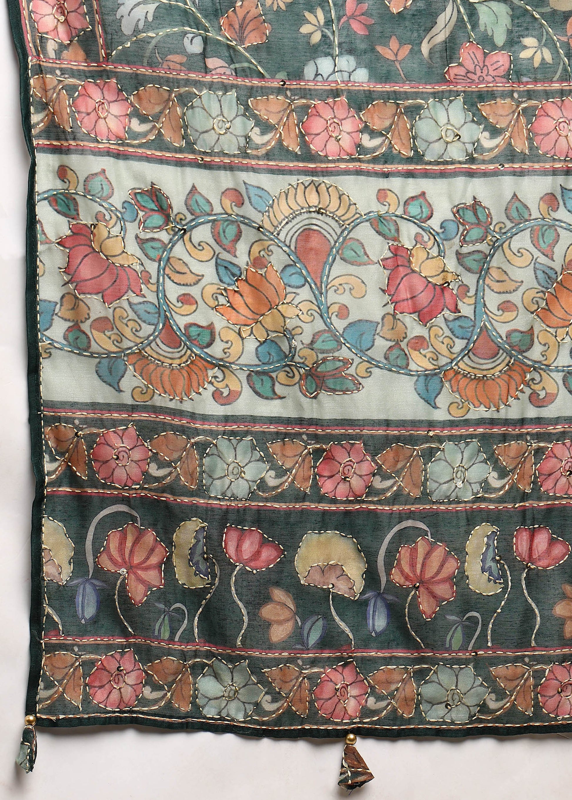 Women's Green Ethnic Motif Printed Kurta with Kantha & Sequin Work, Paired with Trousers and Dupatta