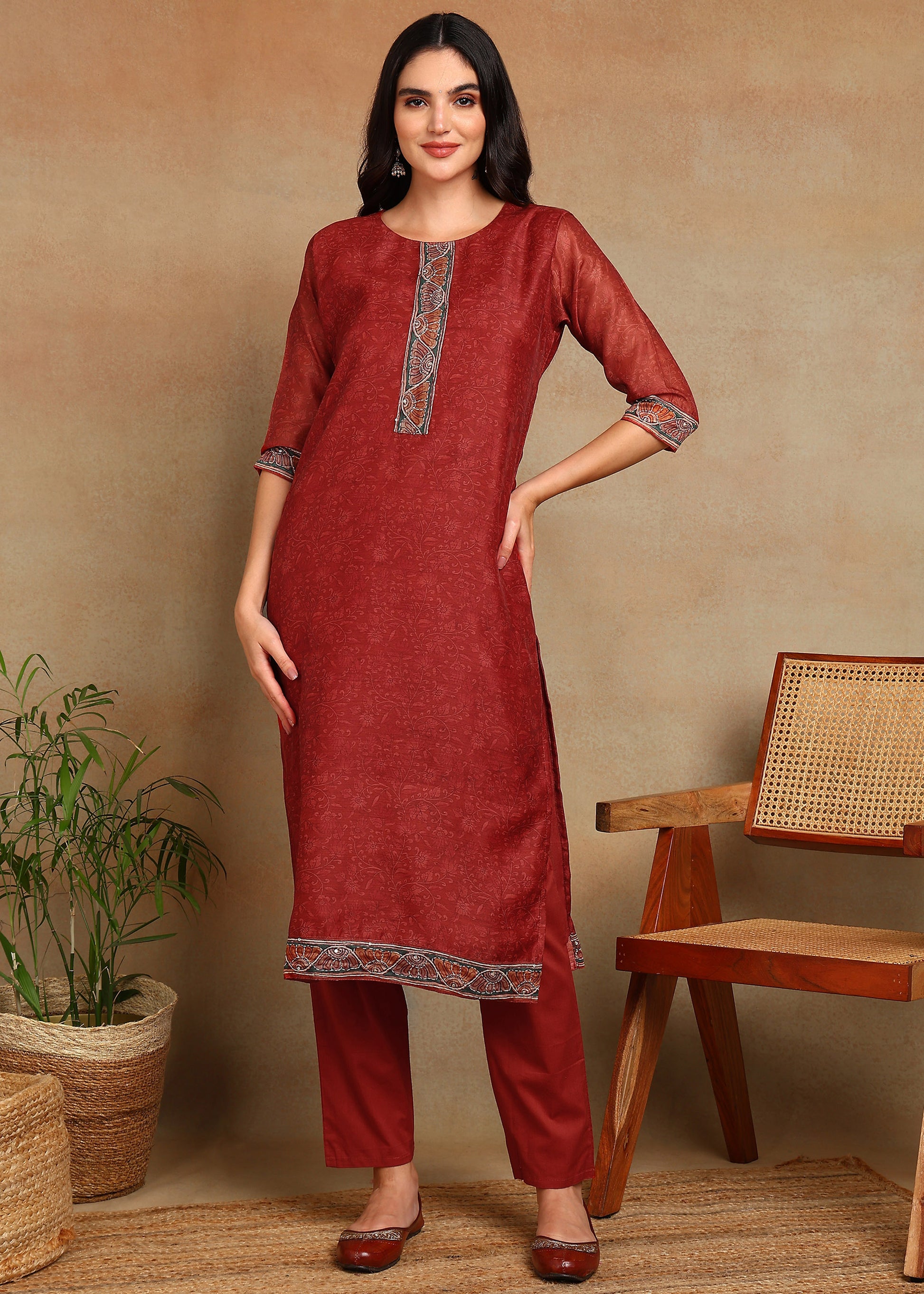 Women's Maroon Ethnic Motif Printed Kurta with Kantha & Sequin Work, Paired with Trousers and Dupatta