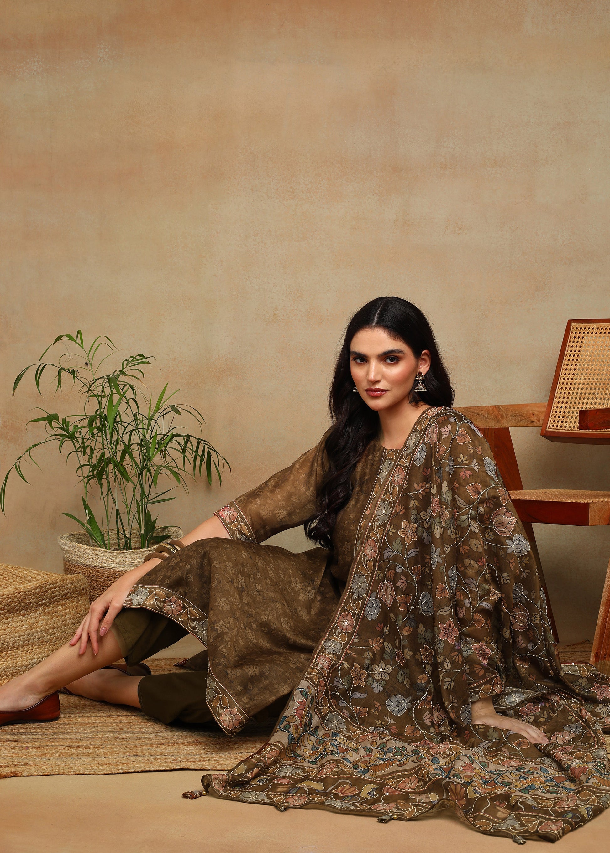 Olive Embroidered Woven Design Straight Kurta and Trousers With Dupatta