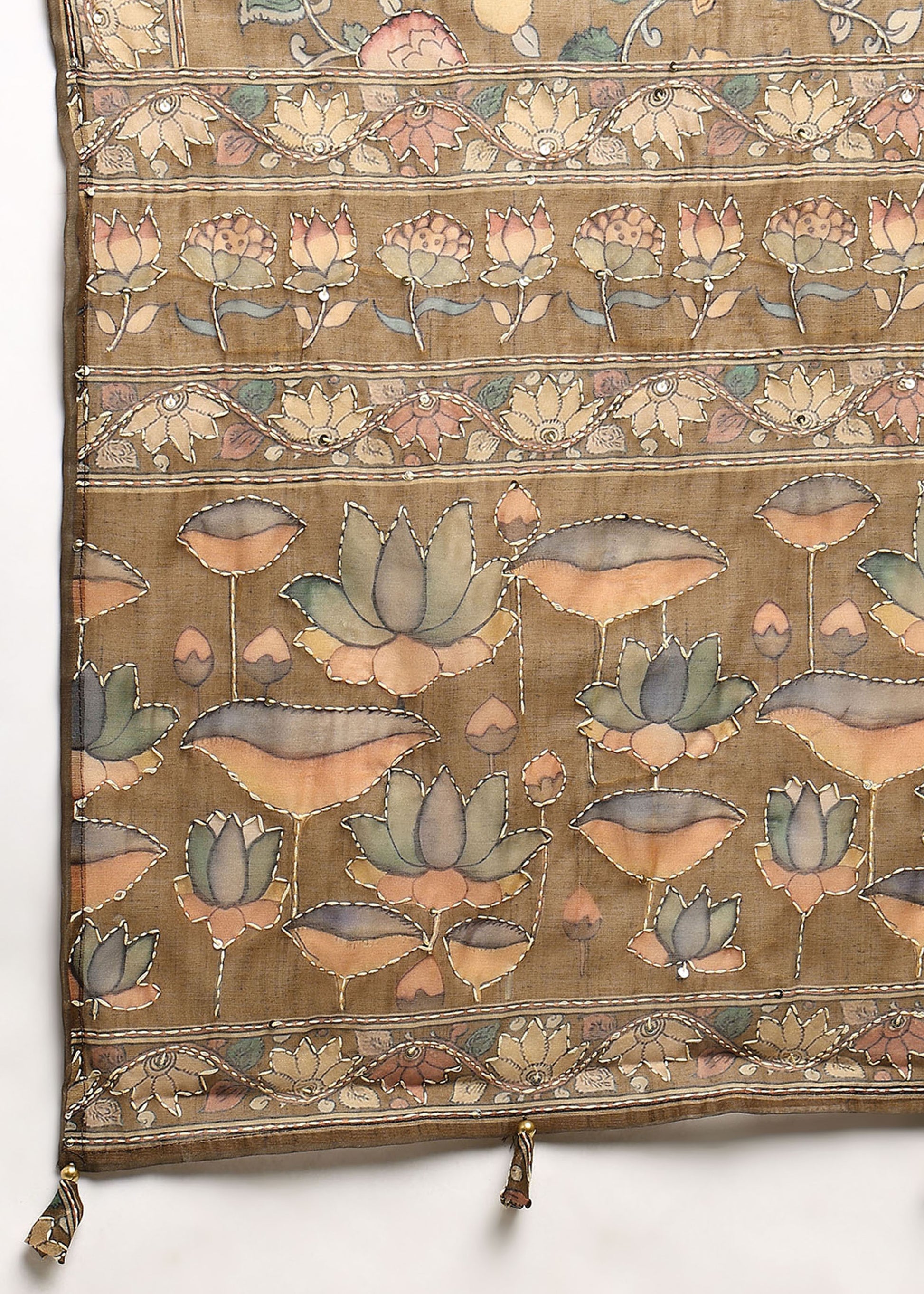 Floral Printed Regular Sequinned Linen Kurta With Trousers & Dupatta