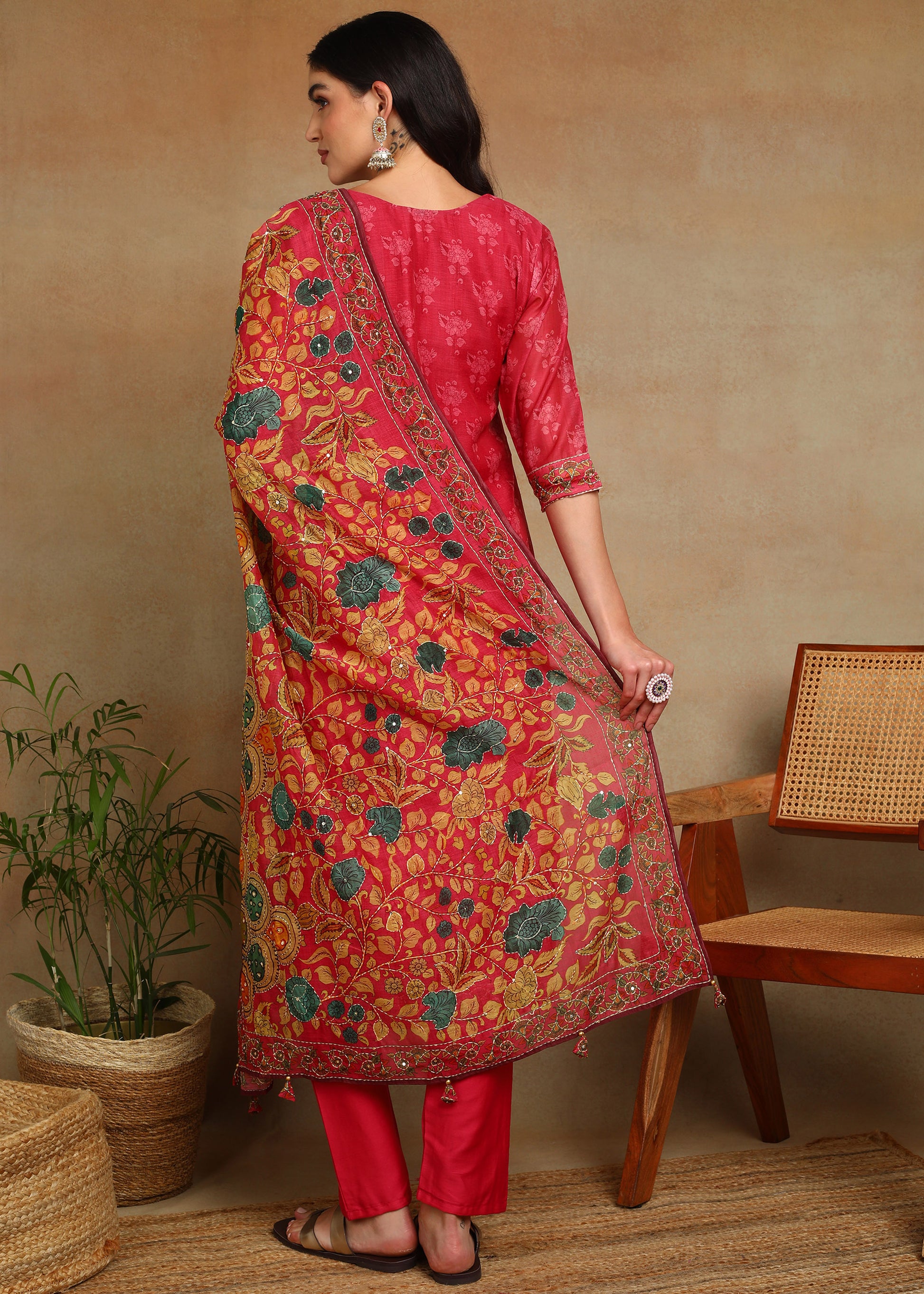 Floral Printed Thread Work Art Silk A-Line Kurta With Trouser & Dupatta