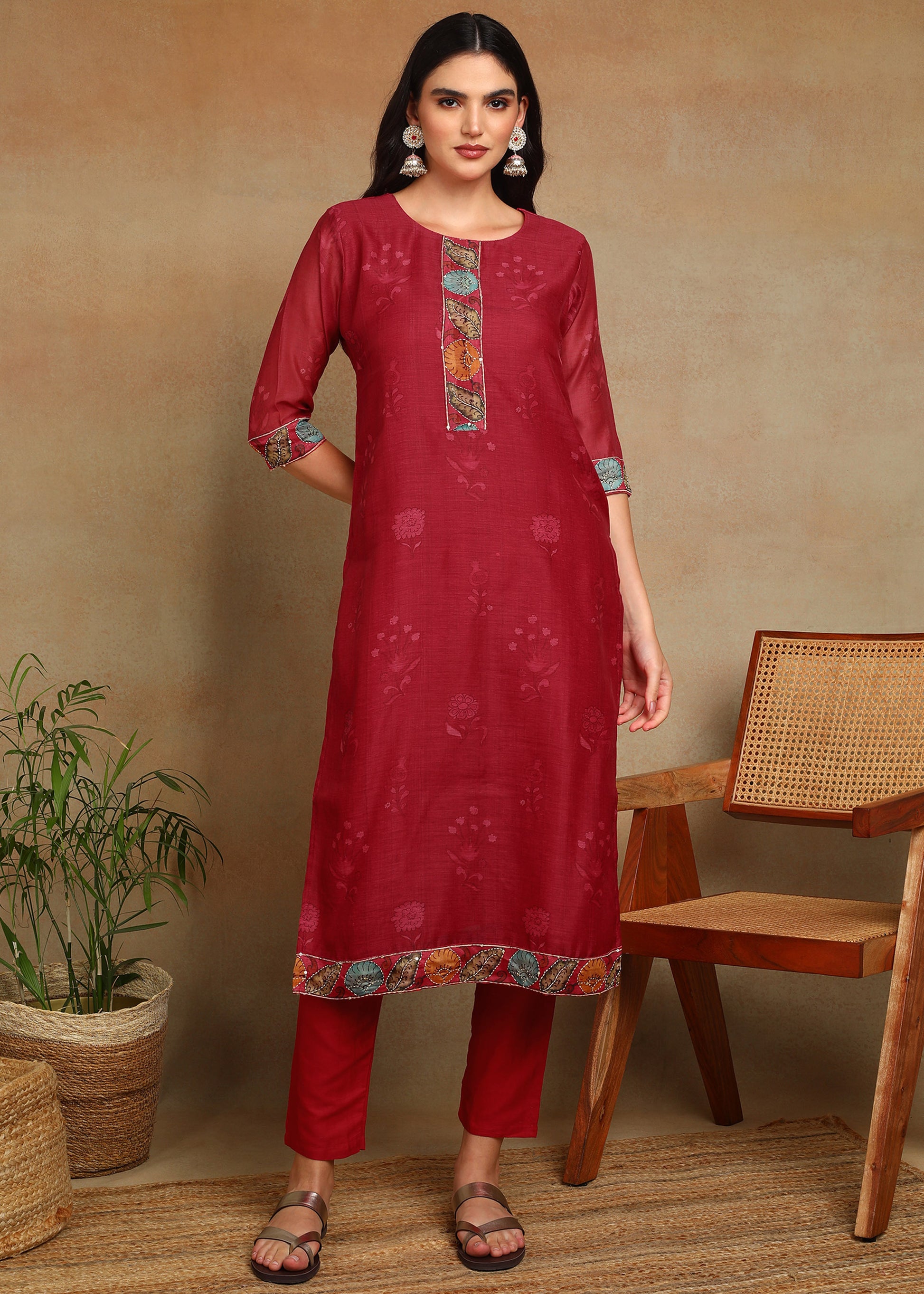 Women's Red Ethnic Motif Printed Kurta with Kantha & Sequin Work, Paired with Trousers and Dupatta