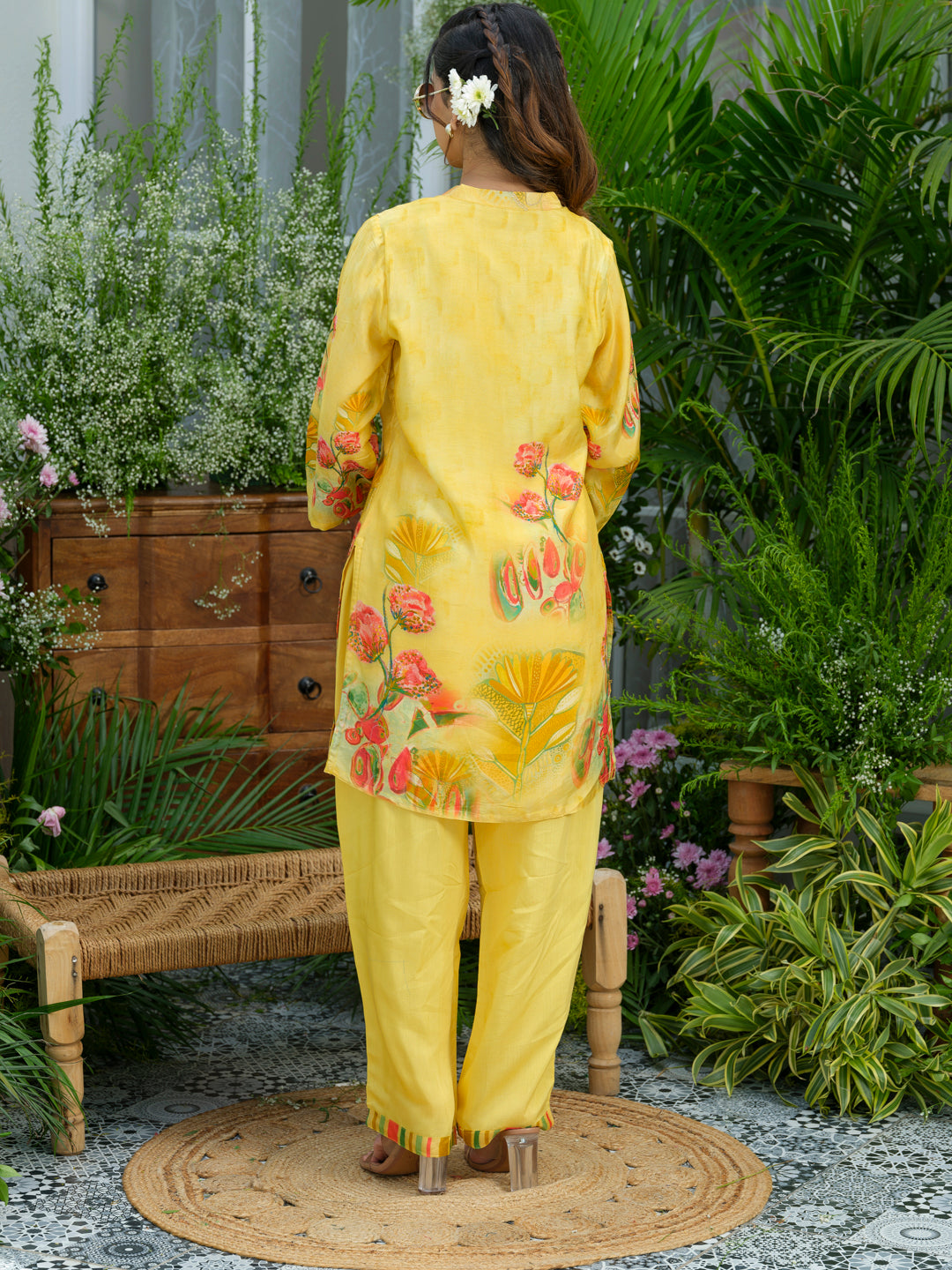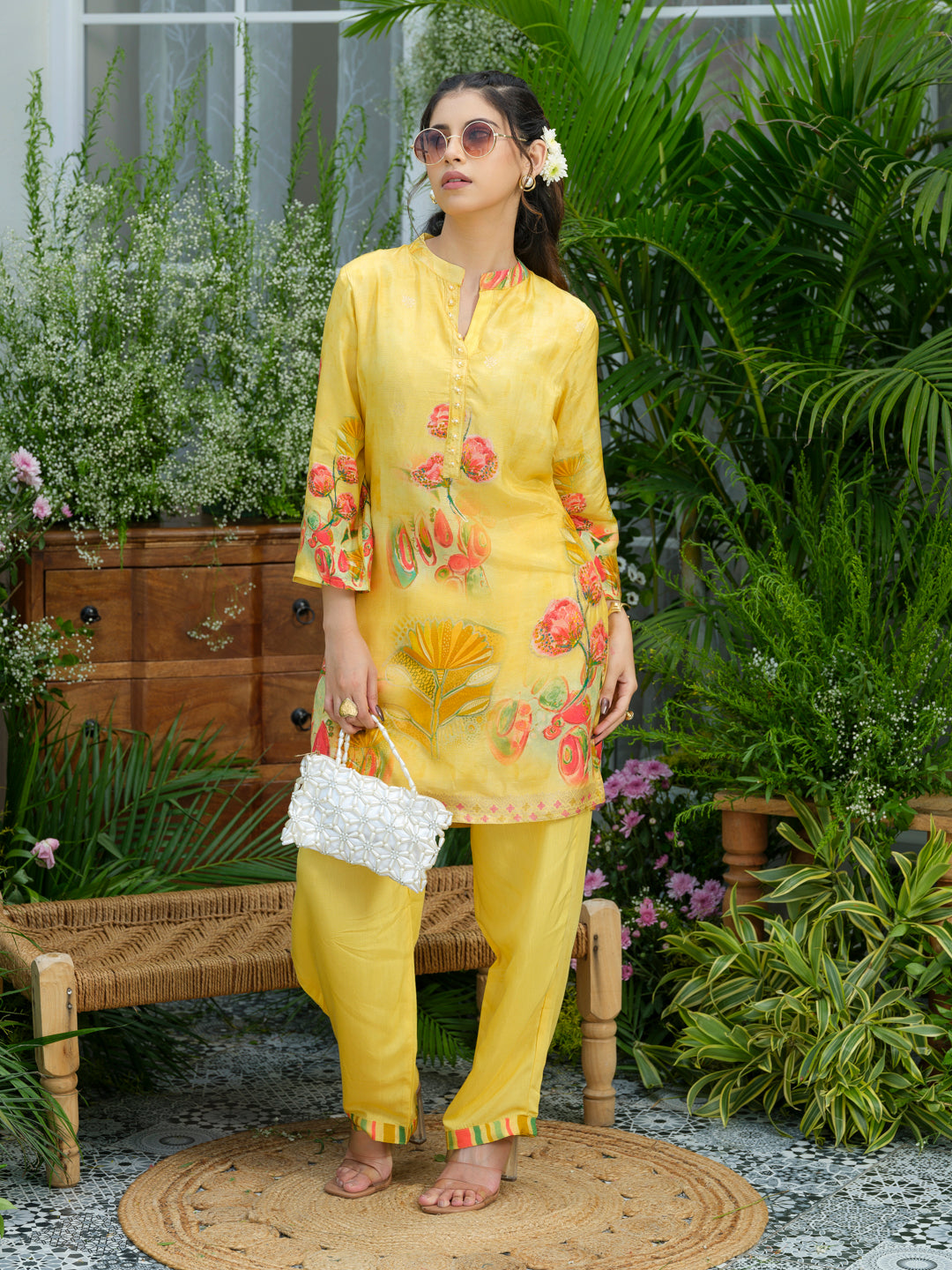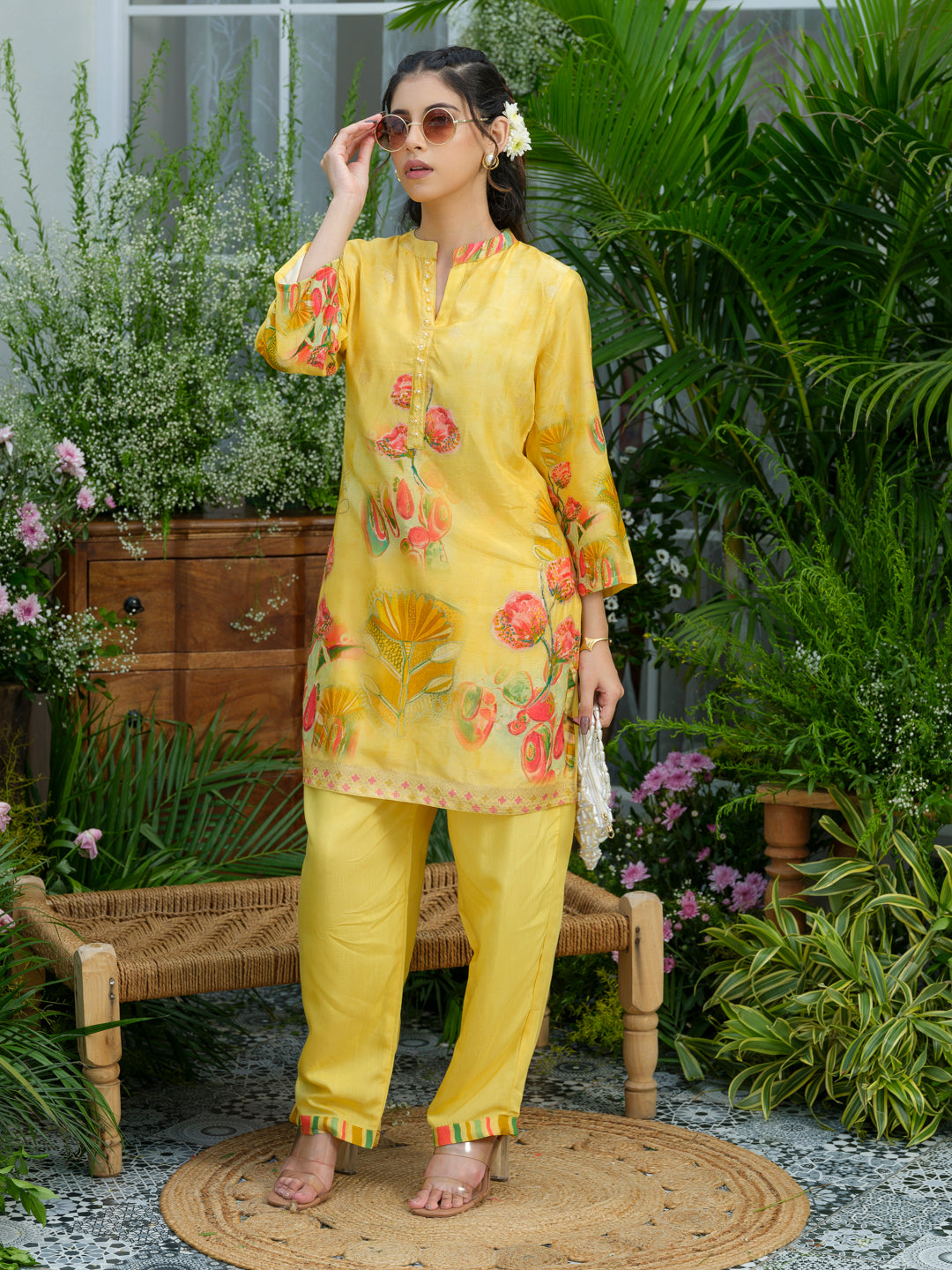Women's Yellow Ethnic Co-ord Set – Floral Kurta with Pants