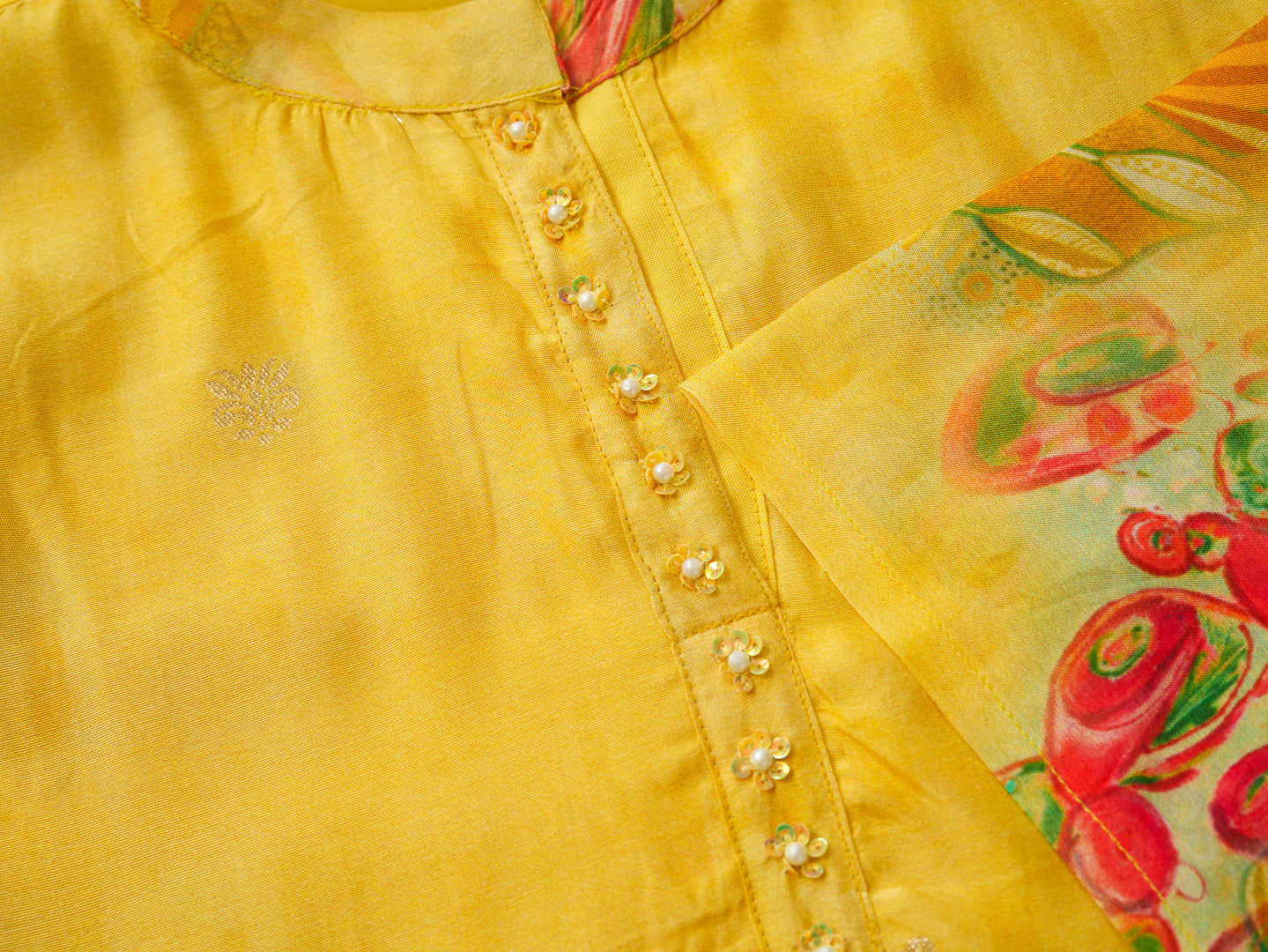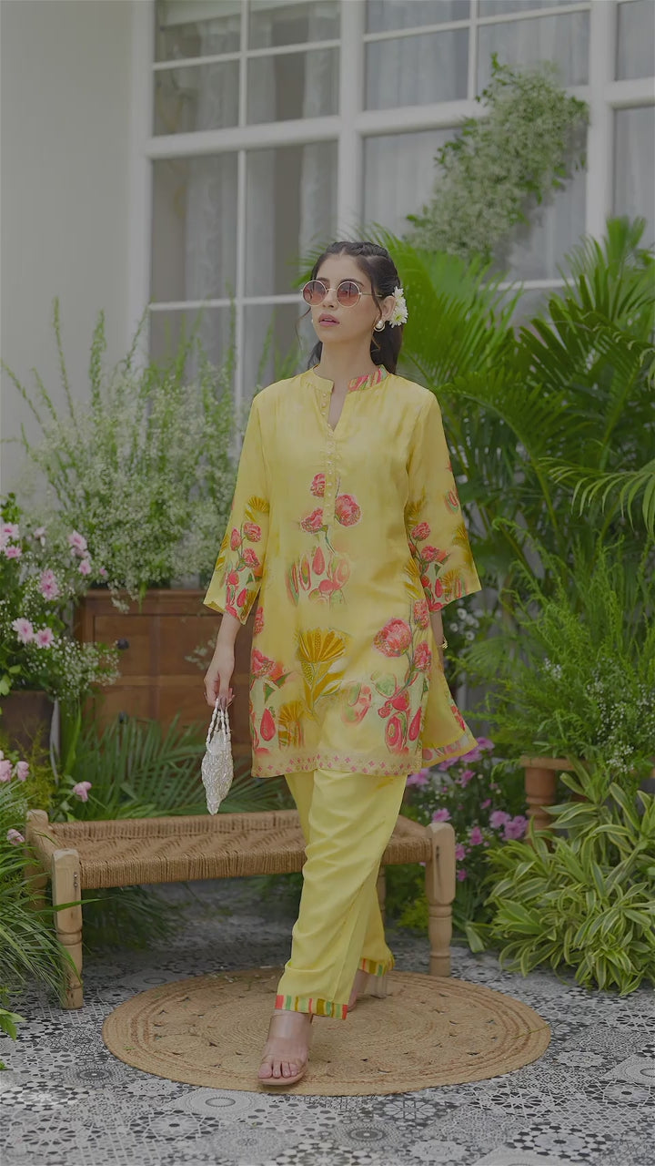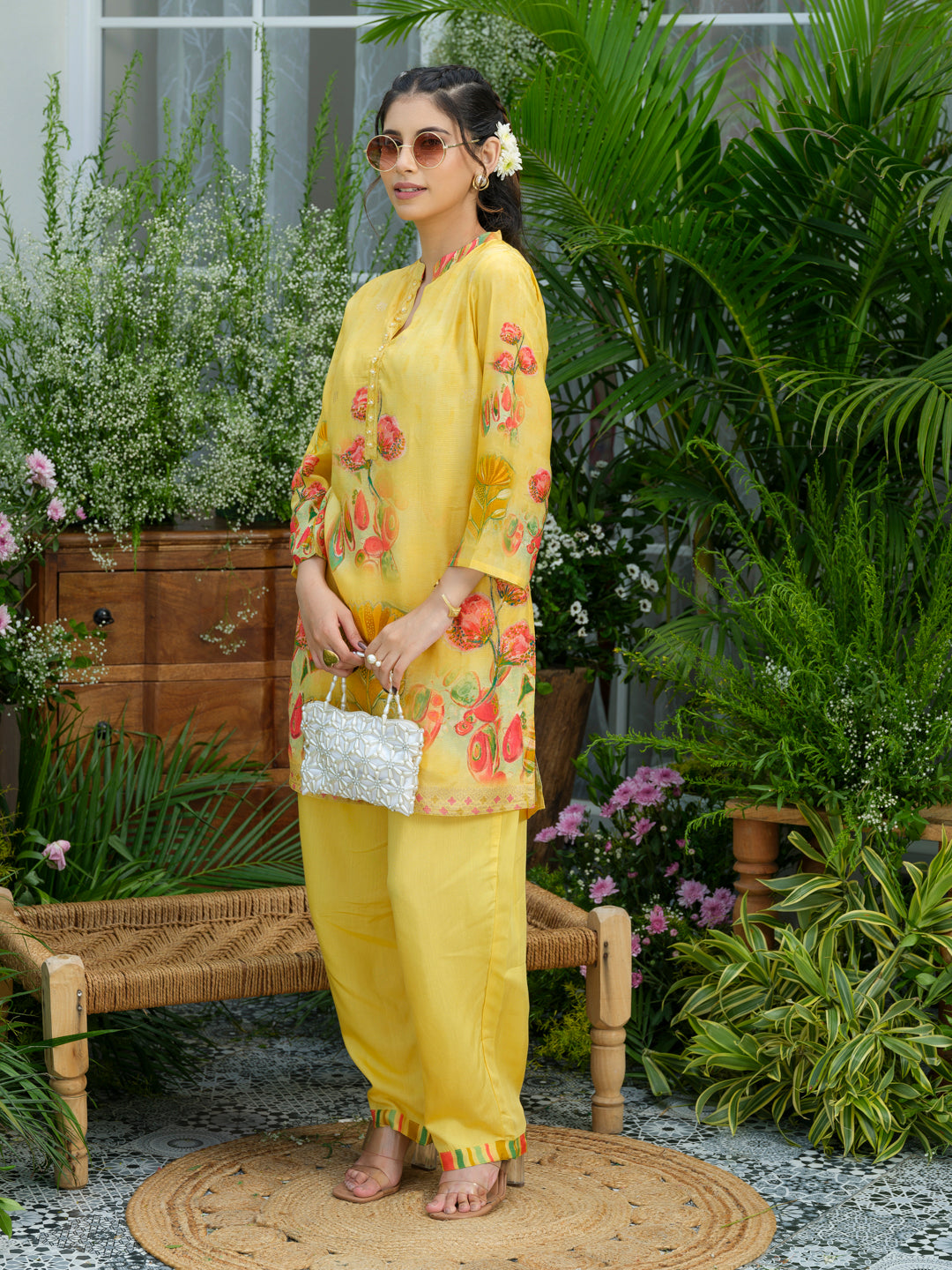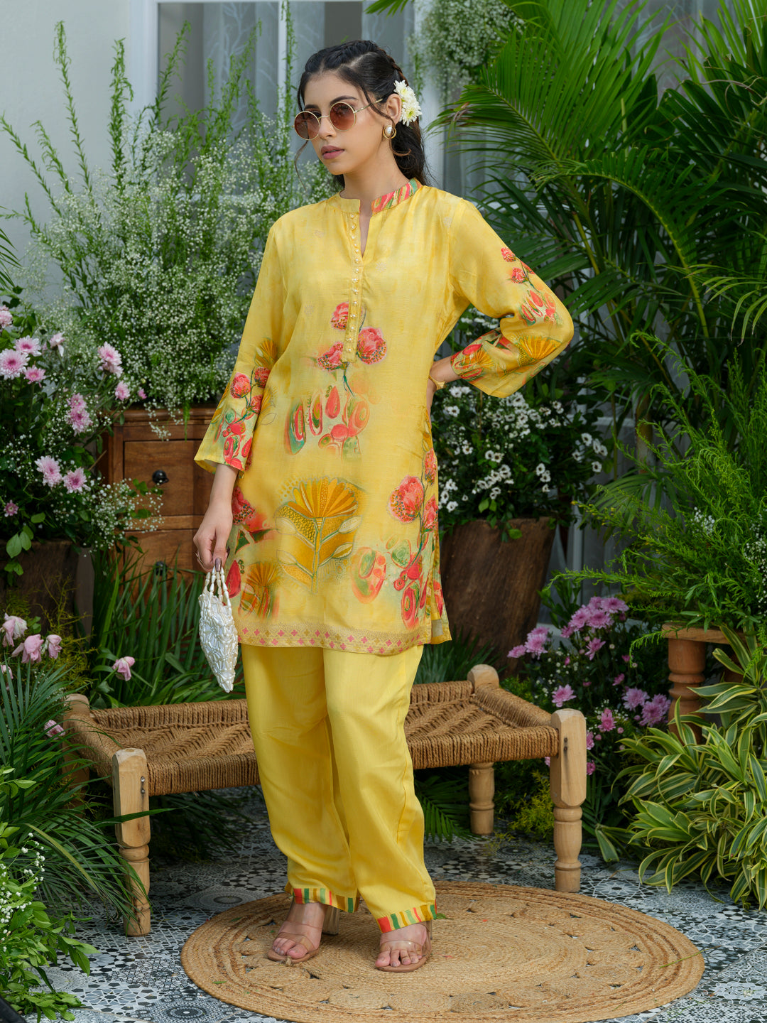 Product Description: Brighten up your ethnic wardrobe with this Yellow Floral Printed Co-ord Set, designed to bring charm and comfort together.