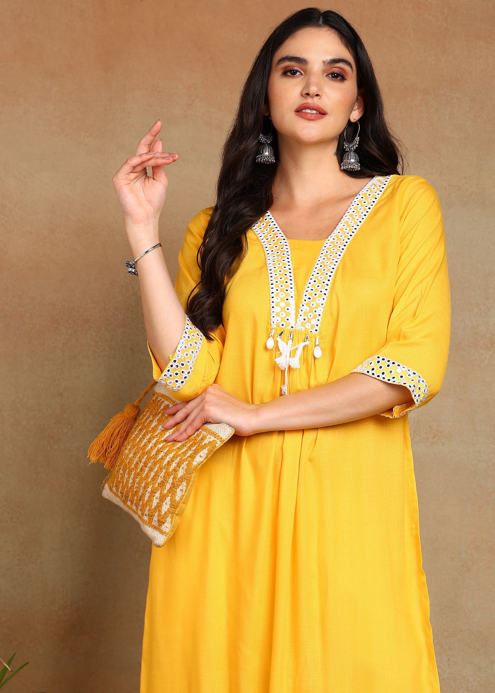 Yellow Rayon Slub Kurti with White Embroidered Lace Detailing